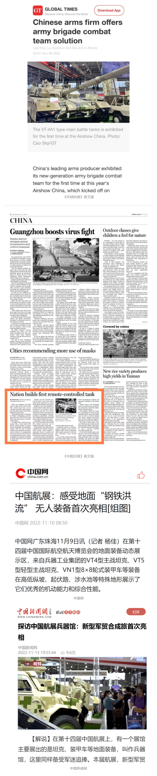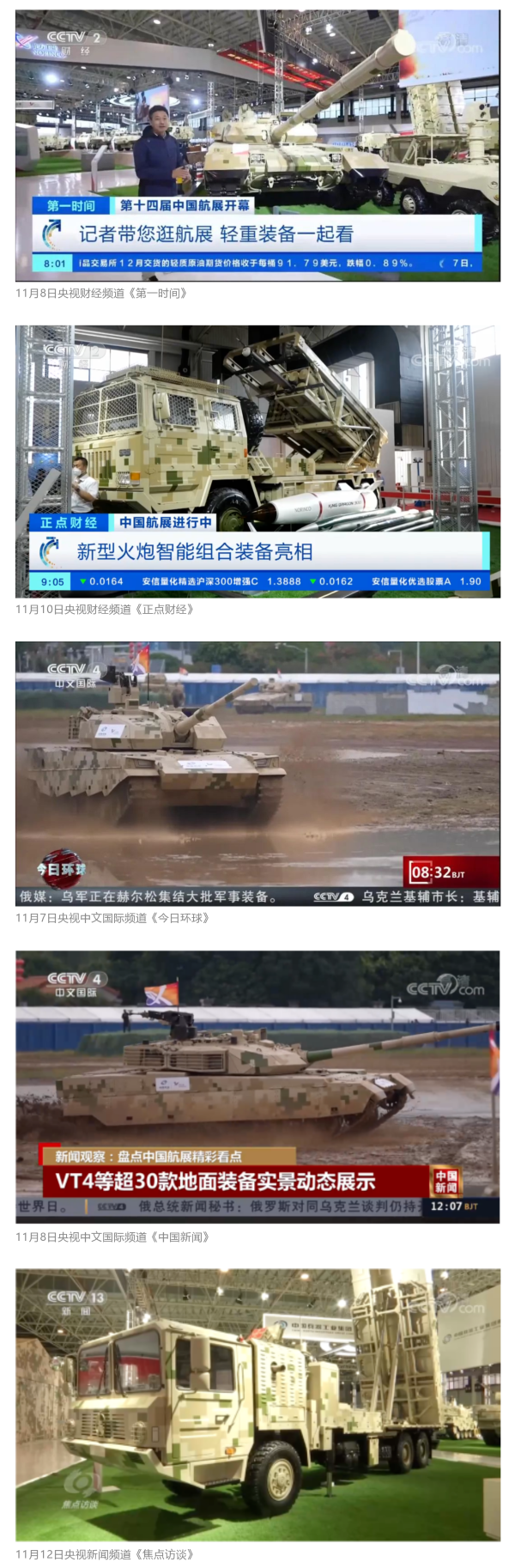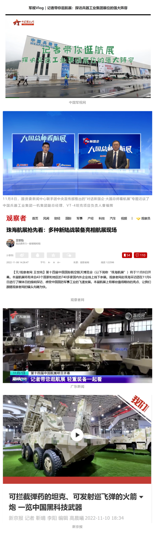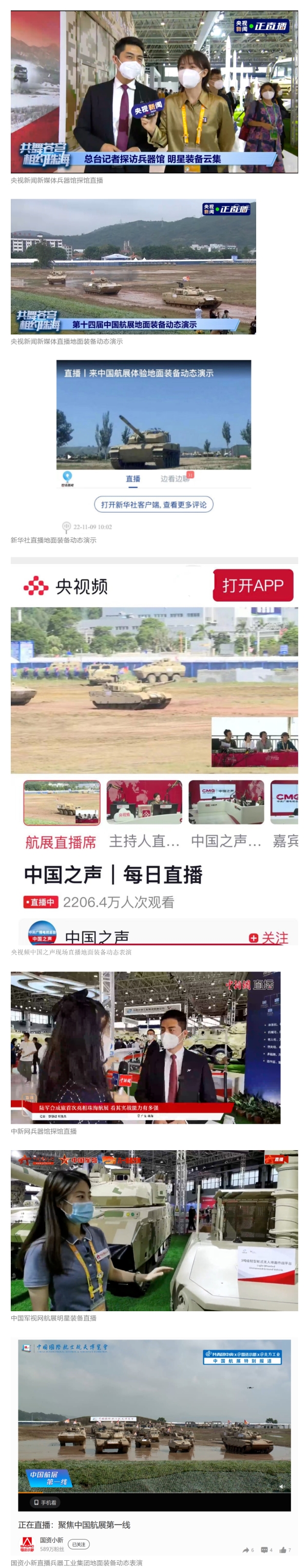 央視(shi)國(guo)(guo)防(fang)軍(jun)(jun)事(shi)(shi)頻道(dao)(dao)航展(zhan)(zhan)(zhan)特別(bie)報(bao)(bao)道(dao)(dao)《炫(xuan)舞天(tian)(tian)地(di)間》11月(yue)(yue)12日(ri)《賞“鐵甲雄風”!看航展(zhan)(zhan)(zhan)地(di)面(mian)裝備“鋼(gang)鐵洪(hong)流”名場面(mian)》對(dui)兵(bing)器(qi)(qi)工業集團(tuan)武器(qi)(qi)裝備特色亮點進(jin)行(xing)報(bao)(bao)道(dao)(dao)。《國(guo)(guo)防(fang)軍(jun)(jun)事(shi)(shi)早報(bao)(bao)》11月(yue)(yue)7日(ri)推(tui)出(chu)報(bao)(bao)道(dao)(dao)《第(di)十四屆中國(guo)(guo)國(guo)(guo)際航空航天(tian)(tian)博覽會明(ming)天(tian)(tian)開幕 中國(guo)(guo)兵(bing)器(qi)(qi)館首(shou)(shou)次(ci)以(yi)陸軍(jun)(jun)合成(cheng)旅(lv)實戰(zhan)體系形式展(zhan)(zhan)(zhan)出(chu)》,對(dui)兵(bing)器(qi)(qi)館陸軍(jun)(jun)合成(cheng)旅(lv)實戰(zhan)體系進(jin)行(xing)報(bao)(bao)道(dao)(dao)。《軍(jun)(jun)事(shi)(shi)報(bao)(bao)道(dao)(dao)》11月(yue)(yue)9日(ri)推(tui)出(chu)《第(di)十四屆中國(guo)(guo)國(guo)(guo)際航空航天(tian)(tian)博覽會 地(di)面(mian)兵(bing)器(qi)(qi)裝備首(shou)(shou)次(ci)聯(lian)合陸航直升(sheng)機進(jin)行(xing)動(dong)態展(zhan)(zhan)(zhan)示》報(bao)(bao)道(dao)(dao)。《軍(jun)(jun)迷行(xing)天(tian)(tian)下(xia)》11月(yue)(yue)9日(ri)推(tui)出(chu)報(bao)(bao)道(dao)(dao)《軍(jun)(jun)迷打卡(ka)航展(zhan)(zhan)(zhan)2022》以(yi)專業軍(jun)(jun)迷視(shi)角探館兵(bing)器(qi)(qi)館,全(quan)面(mian)展(zhan)(zhan)(zhan)示兵(bing)器(qi)(qi)工業集團(tuan)參展(zhan)(zhan)(zhan)裝備特色亮點。