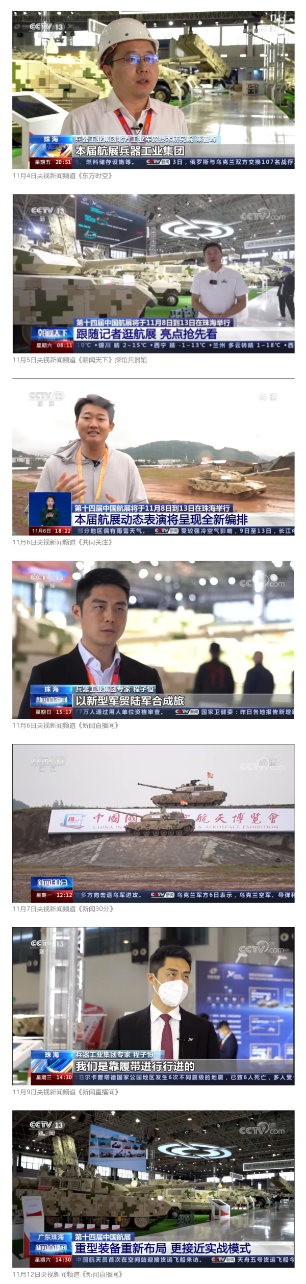 11月4日(ri)至(zhi)12日(ri),央視新(xin)聞(wen)頻道播出《第(di)十(shi)(shi)四(si)屆(jie)(jie)中(zhong)(zhong)國(guo)(guo)(guo)航展(zhan)(zhan)將(jiang)(jiang)于11月8日(ri)到13日(ri)在珠(zhu)(zhu)海(hai)舉行 展(zhan)(zhan)品已就位 中(zhong)(zhong)國(guo)(guo)(guo)航展(zhan)(zhan)進入(ru)倒計時》《第(di)十(shi)(shi)四(si)屆(jie)(jie)中(zhong)(zhong)國(guo)(guo)(guo)航展(zhan)(zhan)將(jiang)(jiang)于11月8日(ri)到13日(ri)在珠(zhu)(zhu)海(hai)舉行 全新(xin)布局 兵器館首次(ci)搭建(jian)實景指揮中(zhong)(zhong)心》《第(di)十(shi)(shi)四(si)屆(jie)(jie)中(zhong)(zhong)國(guo)(guo)(guo)航展(zhan)(zhan)將(jiang)(jiang)于11月8日(ri)到13日(ri)在珠(zhu)(zhu)海(hai)舉行 本屆(jie)(jie)航展(zhan)(zhan)動態表演將(jiang)(jiang)呈現全新(xin)編排》《第(di)十(shi)(shi)四(si)屆(jie)(jie)中(zhong)(zhong)國(guo)(guo)(guo)航展(zhan)(zhan) 有人無(wu)人協同配合(he) 打造(zao)新(xin)型火炮智能組合(he)》《廣東珠(zhu)(zhu)海(hai) 第(di)十(shi)(shi)四(si)屆(jie)(jie)中(zhong)(zhong)國(guo)(guo)(guo)航展(zhan)(zhan) 功能新(xin) 亮點多 地面武器裝(zhuang)備(bei)集中(zhong)(zhong)亮相》《廣東珠(zhu)(zhu)海(hai) 第(di)十(shi)(shi)四(si)屆(jie)(jie)中(zhong)(zhong)國(guo)(guo)(guo)航展(zhan)(zhan) 一批高端裝(zhuang)備(bei)集中(zhong)(zhong)亮相》《廣東珠(zhu)(zhu)海(hai) 第(di)十(shi)(shi)四(si)屆(jie)(jie)中(zhong)(zhong)國(guo)(guo)(guo)航展(zhan)(zhan) 重型裝(zhuang)備(bei)重新(xin)布局 更接近實戰模式》等多篇(pian)新(xin)聞(wen)短片,對兵器工(gong)業集團參展(zhan)(zhan)情(qing)況作(zuo)了全方位專題報道。