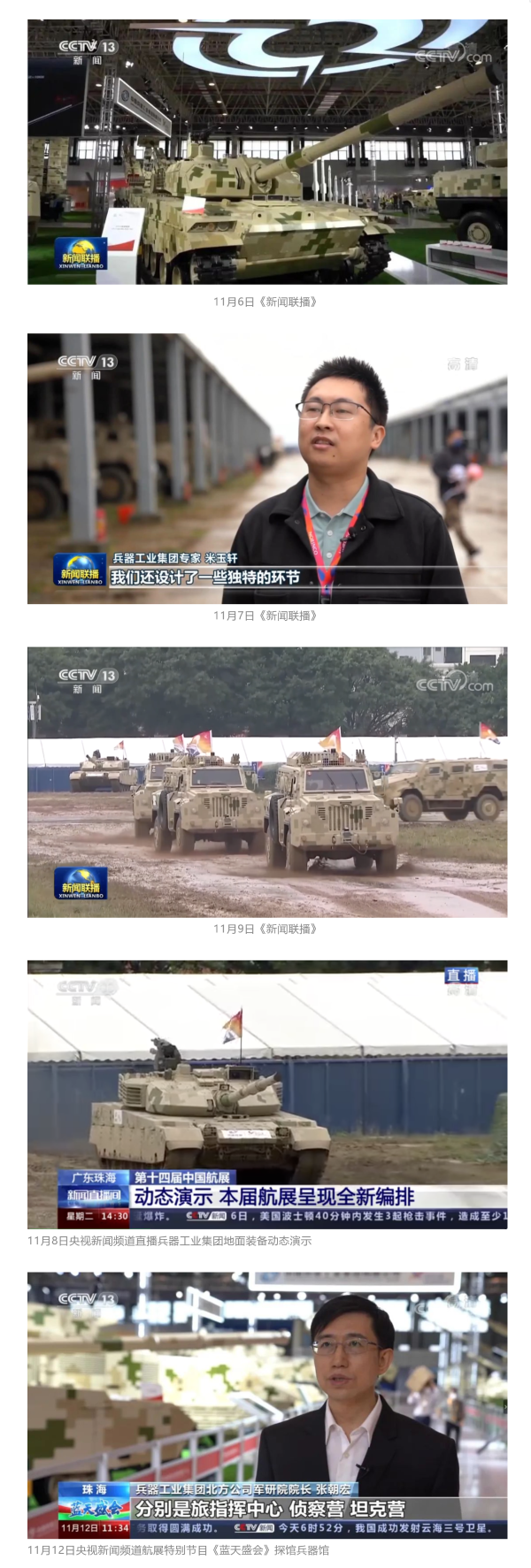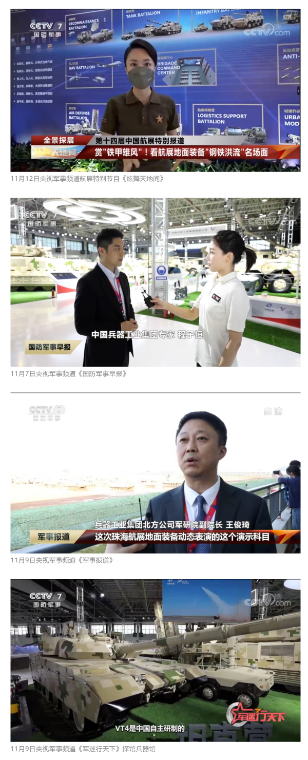 11月6日(ri)、7日(ri)、9日(ri),央視《新聞聯播(bo)》三次報(bao)道(dao)(dao)(dao)兵(bing)(bing)器工業集(ji)(ji)團參展(zhan)情(qing)況(kuang),重點介紹(shao)了(le)集(ji)(ji)團公(gong)司總體參展(zhan)情(qing)況(kuang)、地面裝備動態演示(shi)全新編排、國產輪式反伏擊(ji)車首次采用有人駕(jia)駛和無人駕(jia)駛混(hun)合編隊等內容(rong)。11月8日(ri),央視新聞頻道(dao)(dao)(dao)直(zhi)播(bo)地面裝備動態演示(shi);11月12日(ri),央視新聞頻道(dao)(dao)(dao)航展(zhan)特別報(bao)道(dao)(dao)(dao)《藍天盛會》探訪兵(bing)(bing)器館(guan),采訪兵(bing)(bing)器工業集(ji)(ji)團嘉賓對(dui)陸(lu)軍合成旅作了(le)報(bao)道(dao)(dao)(dao)。