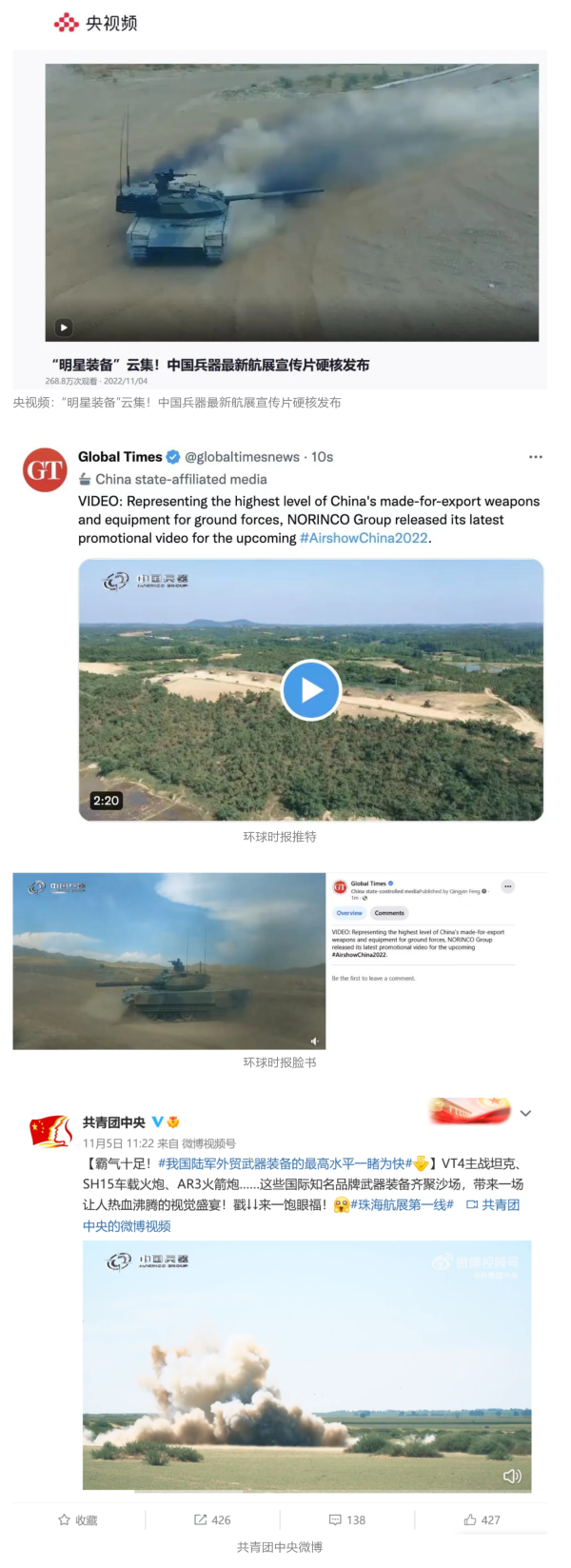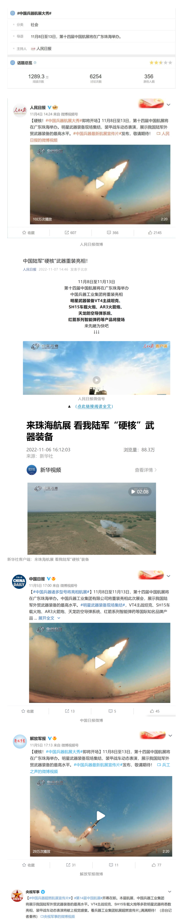 人(ren)(ren)(ren)(ren)民日(ri)報(bao)(bao)(bao)官方微(wei)博(bo)(bo)、微(wei)信公(gong)眾號(hao)(hao)(hao)(hao)(hao)(hao),新(xin)(xin)華社客(ke)戶(hu)端、央視(shi)新(xin)(xin)聞(wen)客(ke)戶(hu)端、中(zhong)(zhong)國(guo)日(ri)報(bao)(bao)(bao)微(wei)博(bo)(bo)、參考消息(xi)微(wei)信公(gong)眾號(hao)(hao)(hao)(hao)(hao)(hao)、解放軍(jun)報(bao)(bao)(bao)微(wei)博(bo)(bo)、央視(shi)軍(jun)事(shi)微(wei)博(bo)(bo)、CGTN微(wei)博(bo)(bo)、中(zhong)(zhong)國(guo)軍(jun)號(hao)(hao)(hao)(hao)(hao)(hao)微(wei)博(bo)(bo)、共青團(tuan)(tuan)中(zhong)(zhong)央微(wei)博(bo)(bo)、環球時報(bao)(bao)(bao)(英文網站、臉(lian)書賬(zhang)號(hao)(hao)(hao)(hao)(hao)(hao)、推特(te)賬(zhang)號(hao)(hao)(hao)(hao)(hao)(hao))、嗶(bi)哩嗶(bi)哩、學習強(qiang)國(guo)平臺(tai)、國(guo)資小(xiao)新(xin)(xin)視(shi)頻(pin)(pin)號(hao)(hao)(hao)(hao)(hao)(hao)、網易軍(jun)事(shi)、騰訊軍(jun)事(shi)、鳳凰軍(jun)事(shi)、北(bei)京日(ri)報(bao)(bao)(bao)、東方衛視(shi)看(kan)看(kan)新(xin)(xin)聞(wen)全媒(mei)體、北(bei)京電視(shi)臺(tai)等20余(yu)家(jia)(jia)中(zhong)(zhong)央主流媒(mei)體、國(guo)家(jia)(jia)部委、省市(shi)媒(mei)體的新(xin)(xin)媒(mei)體第一(yi)時間播發(fa)集團(tuan)(tuan)公(gong)司(si)(si)航(hang)展(zhan)(zhan)宣傳片(pian)(pian)等視(shi)頻(pin)(pin)作品(pin)燃(ran)爆全網,累計閱(yue)讀量(liang)(liang)突破(po)1700萬(wan)人(ren)(ren)(ren)(ren)次。集團(tuan)(tuan)公(gong)司(si)(si)微(wei)信公(gong)眾號(hao)(hao)(hao)(hao)(hao)(hao)、微(wei)博(bo)(bo)、抖音號(hao)(hao)(hao)(hao)(hao)(hao)、快手號(hao)(hao)(hao)(hao)(hao)(hao)、微(wei)信視(shi)頻(pin)(pin)號(hao)(hao)(hao)(hao)(hao)(hao)、知乎(hu)號(hao)(hao)(hao)(hao)(hao)(hao)等新(xin)(xin)媒(mei)體宣傳片(pian)(pian)播放閱(yue)讀量(liang)(liang)超過800萬(wan)人(ren)(ren)(ren)(ren)次,點贊超過30萬(wan)人(ren)(ren)(ren)(ren)次。集團(tuan)(tuan)公(gong)司(si)(si)微(wei)信公(gong)眾號(hao)(hao)(hao)(hao)(hao)(hao)推出《硬(ying)核!中(zhong)(zhong)國(guo)兵(bing)器(qi)(qi)最(zui)新(xin)(xin)航(hang)展(zhan)(zhan)宣傳片(pian)(pian)發(fa)布》《中(zhong)(zhong)國(guo)兵(bing)器(qi)(qi)航(hang)展(zhan)(zhan)節目單,請選出心中(zhong)(zhong)明星(xing)裝備》《航(hang)展(zhan)(zhan)首日(ri),中(zhong)(zhong)國(guo)兵(bing)器(qi)(qi)閃(shan)耀亮(liang)相!》等7篇報(bao)(bao)(bao)道,閱(yue)讀量(liang)(liang)超過25萬(wan)人(ren)(ren)(ren)(ren)次,集團(tuan)(tuan)公(gong)司(si)(si)微(wei)信視(shi)頻(pin)(pin)號(hao)(hao)(hao)(hao)(hao)(hao)、抖音號(hao)(hao)(hao)(hao)(hao)(hao)、快手號(hao)(hao)(hao)(hao)(hao)(hao)等新(xin)(xin)媒(mei)體賬(zhang)號(hao)(hao)(hao)(hao)(hao)(hao)發(fa)布“中(zhong)(zhong)國(guo)兵(bing)器(qi)(qi)航(hang)展(zhan)(zhan)大秀”系列視(shi)頻(pin)(pin),觀看(kan)量(liang)(liang)超過330萬(wan)人(ren)(ren)(ren)(ren)次。