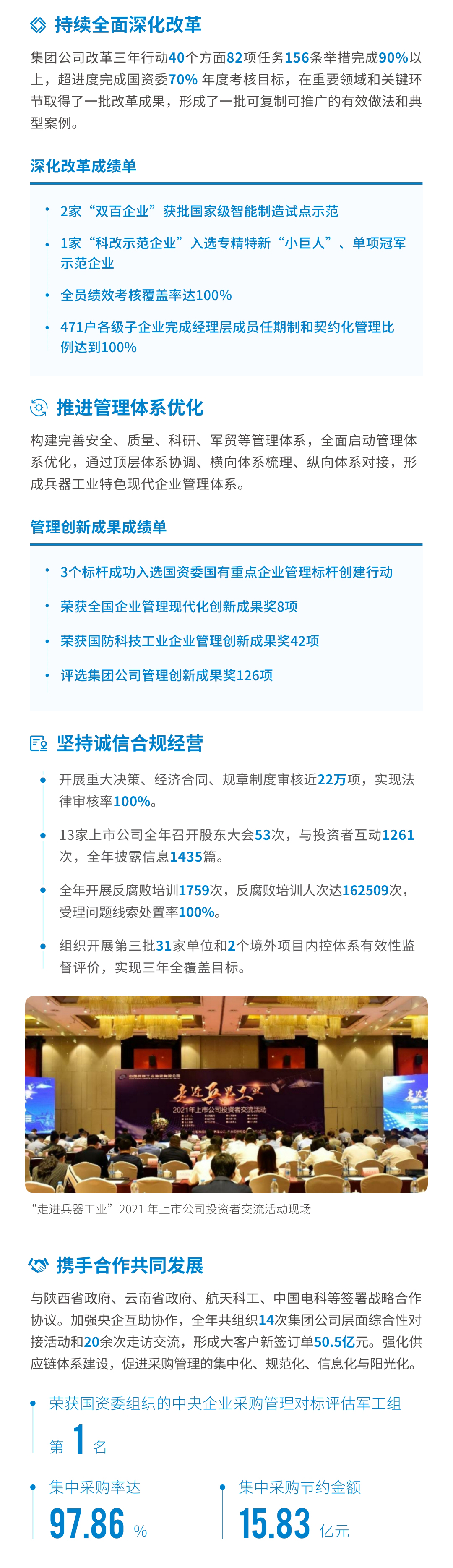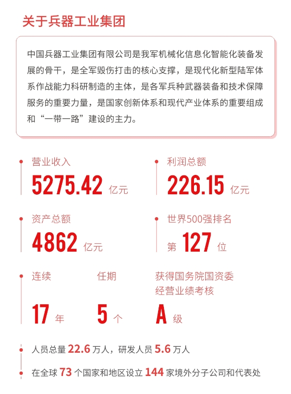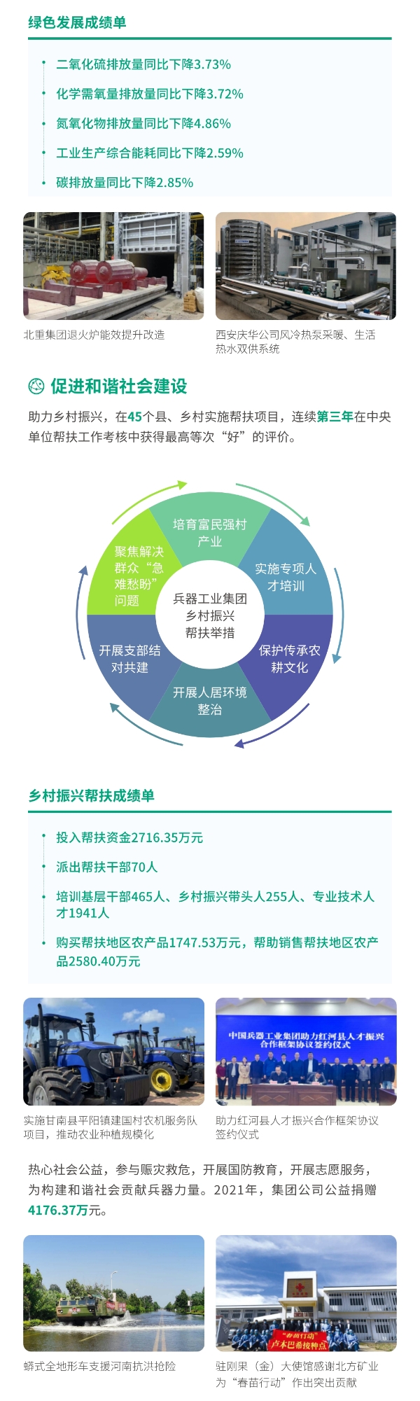近日(ri),兵(bing)器工業(ye)集團(tuan)(tuan)正式發(fa)布第十三(san)份年(nian)度社(she)會(hui)(hui)責任(ren)報(bao)告(gao)——《中國兵(bing)器工業(ye)集團(tuan)(tuan)有限(xian)公(gong)司(si)2021年(nian)社(she)會(hui)(hui)責任(ren)報(bao)告(gao)》,以“用心(xin)守(shou)護(hu)和平(ping)、用力爭創一流、用情溫暖社(she)會(hui)(hui)”為主題,從恪(ke)守(shou)強軍首責、服務經(jing)濟建設、共創美好(hao)生活三(san)個(ge)維度,向社(she)會(hui)(hui)全(quan)面(mian)披(pi)露2021年(nian)度履責實踐(jian)和履責業(ye)績。《報(bao)告(gao)》連續第三(san)年(nian)獲得(de)中國企(qi)業(ye)社(she)會(hui)(hui)責任(ren)報(bao)告(gao)評級專家委員會(hui)(hui)“五星佳(jia)”評級,兵(bing)器工業(ye)集團(tuan)(tuan)成為軍工行(xing)業(ye)唯一連續11年(nian)獲得(de)五星及五星佳(jia)最高評級的企(qi)業(ye)。 一圖解碼兵器工業的“責任力量”