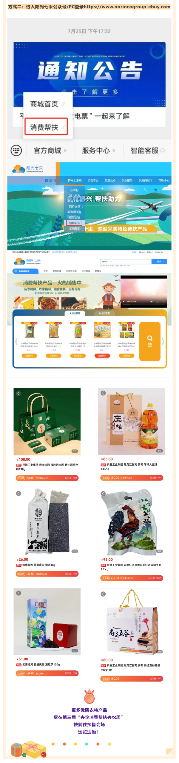 百家央企聚合力 消費幫扶促振興 第三屆“央企消費幫扶興農周” 預售已啟動 8月30日 興農周活動將正式開啟 “央企消費幫扶興農周”由國務院(yuan)國資委(wei)社(she)會責任局指(zhi)導(dao),央企消費(fei)幫扶電商(shang)平臺(國網數字科技(ji)控(kong)股有限公(gong)司)主辦,國務院(yuan)國資委(wei)機關(guan)服務管理局、國務院(yuan)國資委(wei)新聞中心、國網北京市(shi)電力公(gong)司、各中央企業電商(shang)平臺聯(lian)合協辦。 活動以“央企攜手,興農惠民”為主題,組織動員中央企業所屬各單位各部門(特別是工會、食堂)、廣大干部職工、上下游供應商和業務合作伙伴采購幫扶縣的優質農產品,促進脫貧地區產業發展和脫貧群眾穩定增收,鞏固拓展脫貧攻堅成果。 預售活動火熱開啟 為方便大家提前選購 此次預售期升級為10天 (8月20日-8月29日) 誠邀下單 兵器工業集團定點幫扶 黑龍江甘南縣、云南紅河縣 農特產品! 8月30日-9月5日 請鎖定“央企館-兵器工業集團” 我們一起共譜鄉村振興新篇章! |