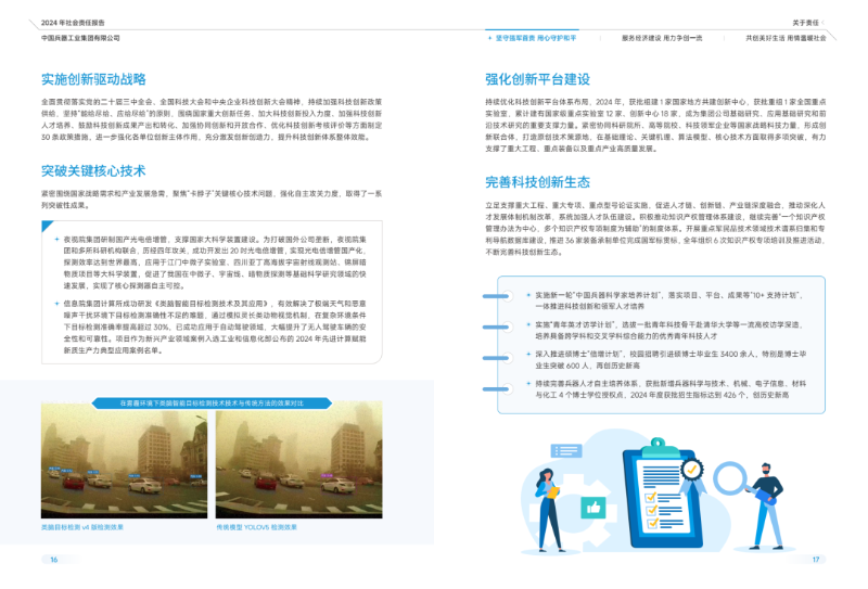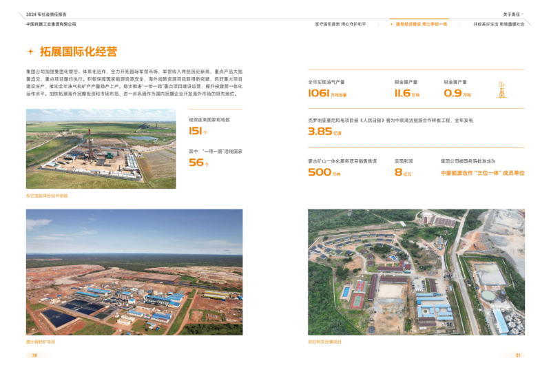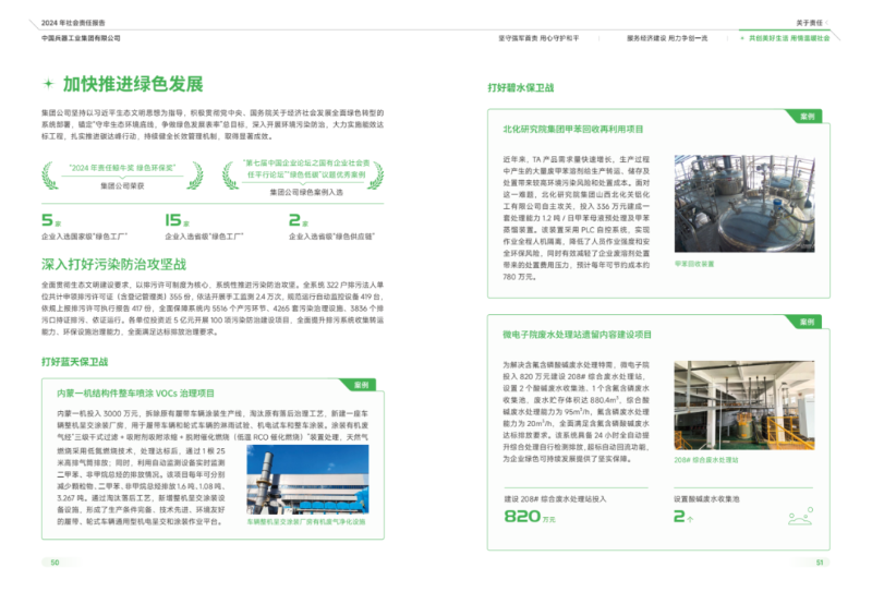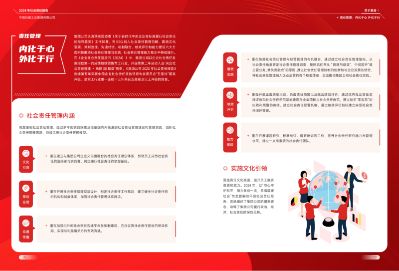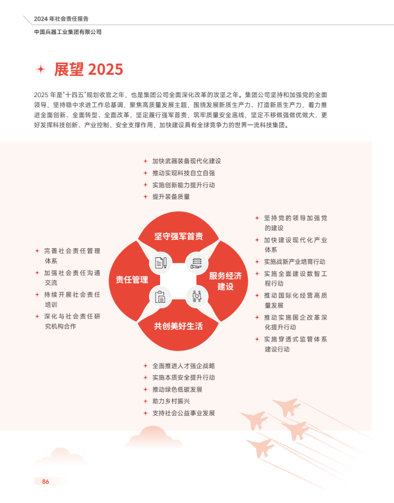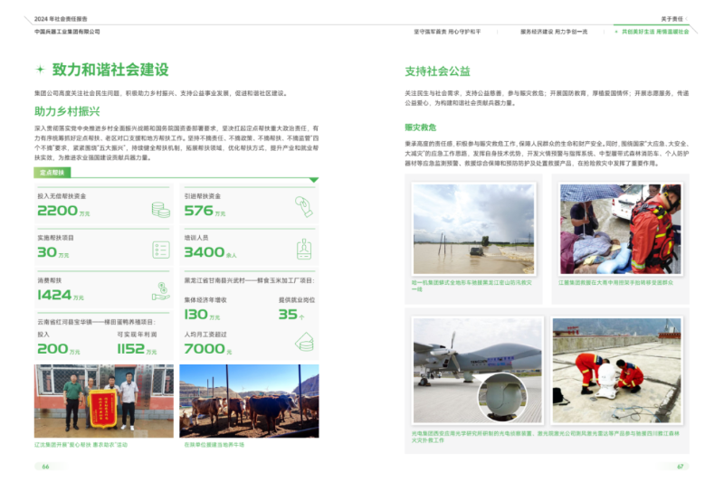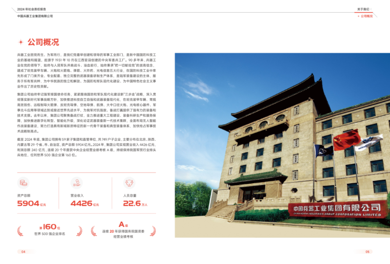 近日,中(zhong)(zhong)国(guo)兵器工业(ye)集团有限公(gong)司(si)正式发布《中(zhong)(zhong)国(guo)兵器工业(ye)集团有限公(gong)司(si)2024年度社(she)(she)会责(ze)任(ren)(ren)报告》。本次报告是集团公(gong)司(si)第16份年度社(she)(she)会责(ze)任(ren)(ren)报告,从坚守(shou)强军(jun)首责(ze)、服务经(jing)(jing)济建设(she)、共创美好生活(huo)三(san)个维度,全面展(zhan)示(shi)集团公(gong)司(si)履行社(she)(she)会责(ze)任(ren)(ren)的(de)实(shi)践与成效。经(jing)(jing)中(zhong)(zhong)国(guo)企(qi)业(ye)社(she)(she)会责(ze)任(ren)(ren)报告评(ping)级专家委员会评(ping)定,《报告》获得“五星佳”最高评(ping)级,成为军(jun)工行业(ye)唯(wei)一一家连(lian)续(xu)6年获此(ci)殊荣的(de)中(zhong)(zhong)央(yang)企(qi)业(ye)。 兵器工业(ye)集团2024年度社会责(ze)任报(bao)告 部分内容摘录 ↓↓↓