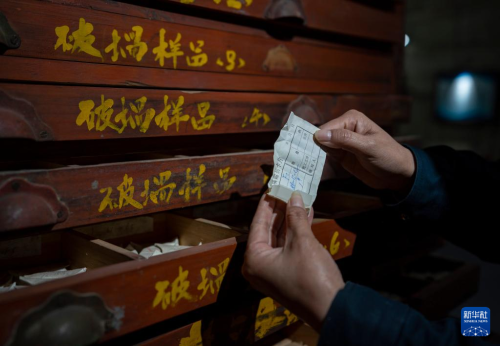 5月16日,工作人員在展示玻璃樣品柜內的一個玻璃樣品。