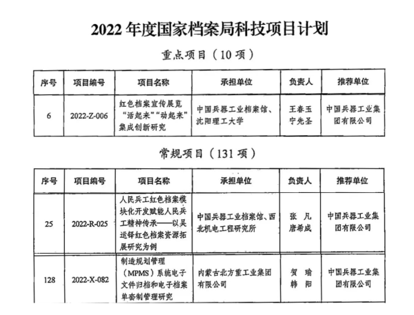 為深入貫徹落實《“十四五”全國(guo)(guo)檔(dang)(dang)(dang)(dang)(dang)案(an)(an)(an)(an)(an)(an)事業(ye)發展規(gui)劃(hua)》要(yao)求,著力提升檔(dang)(dang)(dang)(dang)(dang)案(an)(an)(an)(an)(an)(an)科(ke)研自主(zhu)創(chuang)新(xin)能(neng)力,根(gen)據(ju)《國(guo)(guo)家檔(dang)(dang)(dang)(dang)(dang)案(an)(an)(an)(an)(an)(an)局辦公(gong)室關于開展2022年(nian)度國(guo)(guo)家檔(dang)(dang)(dang)(dang)(dang)案(an)(an)(an)(an)(an)(an)局科(ke)技(ji)(ji)項目(mu)(mu)立(li)(li)項工(gong)(gong)作的通知(zhi)》要(yao)求,中(zhong)國(guo)(guo)兵器(qi)工(gong)(gong)業(ye)集團檔(dang)(dang)(dang)(dang)(dang)案(an)(an)(an)(an)(an)(an)館(以下(xia)簡稱檔(dang)(dang)(dang)(dang)(dang)案(an)(an)(an)(an)(an)(an)館)依據(ju)《2022年(nian)科(ke)技(ji)(ji)項目(mu)(mu)立(li)(li)項選(xuan)題指(zhi)南》,組織各單位申報成(cheng)功三(san)個檔(dang)(dang)(dang)(dang)(dang)案(an)(an)(an)(an)(an)(an)科(ke)技(ji)(ji)項目(mu)(mu)在國(guo)(guo)家檔(dang)(dang)(dang)(dang)(dang)案(an)(an)(an)(an)(an)(an)局立(li)(li)項,其中(zhong)一(yi)個項目(mu)(mu)為國(guo)(guo)家級10項重(zhong)點項目(mu)(mu)之一(yi),排(pai)名第六,這是繼2021年(nian)在國(guo)(guo)家檔(dang)(dang)(dang)(dang)(dang)案(an)(an)(an)(an)(an)(an)局首次立(li)(li)項三(san)個項目(mu)(mu)后的又一(yi)重(zhong)大突破,標(biao)志著兵器(qi)工(gong)(gong)業(ye)檔(dang)(dang)(dang)(dang)(dang)案(an)(an)(an)(an)(an)(an)科(ke)研工(gong)(gong)作邁上新(xin)臺階。