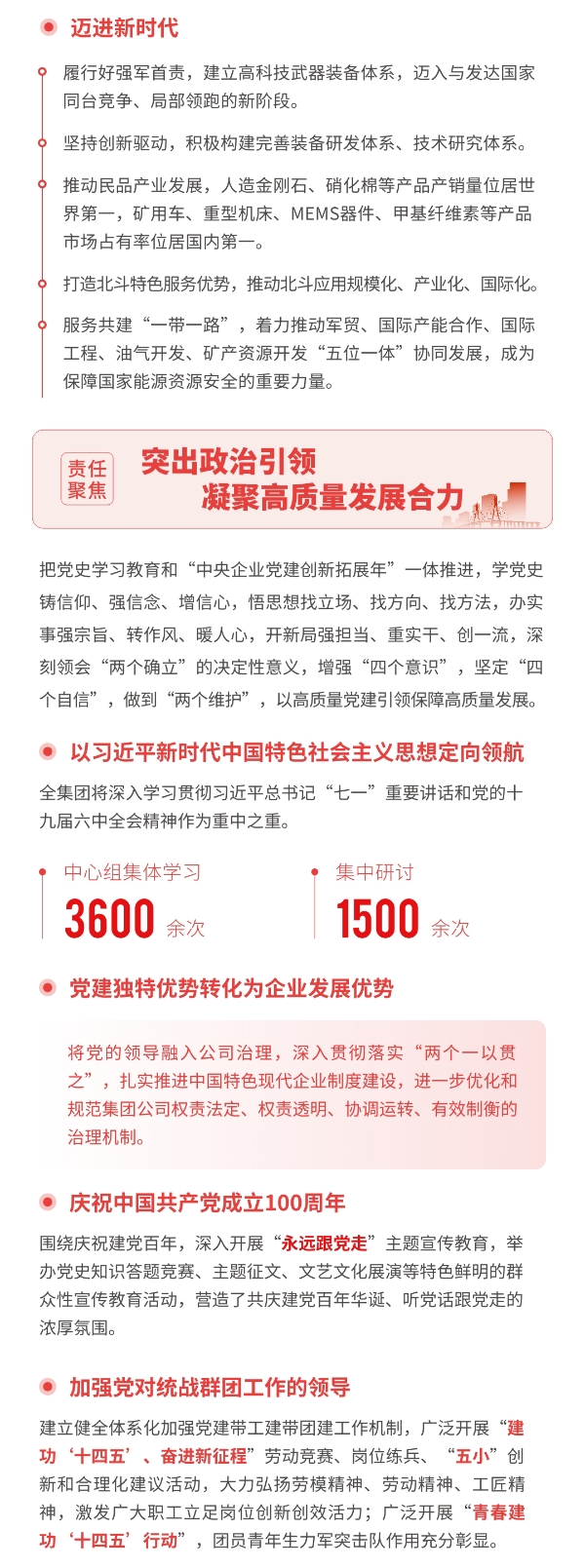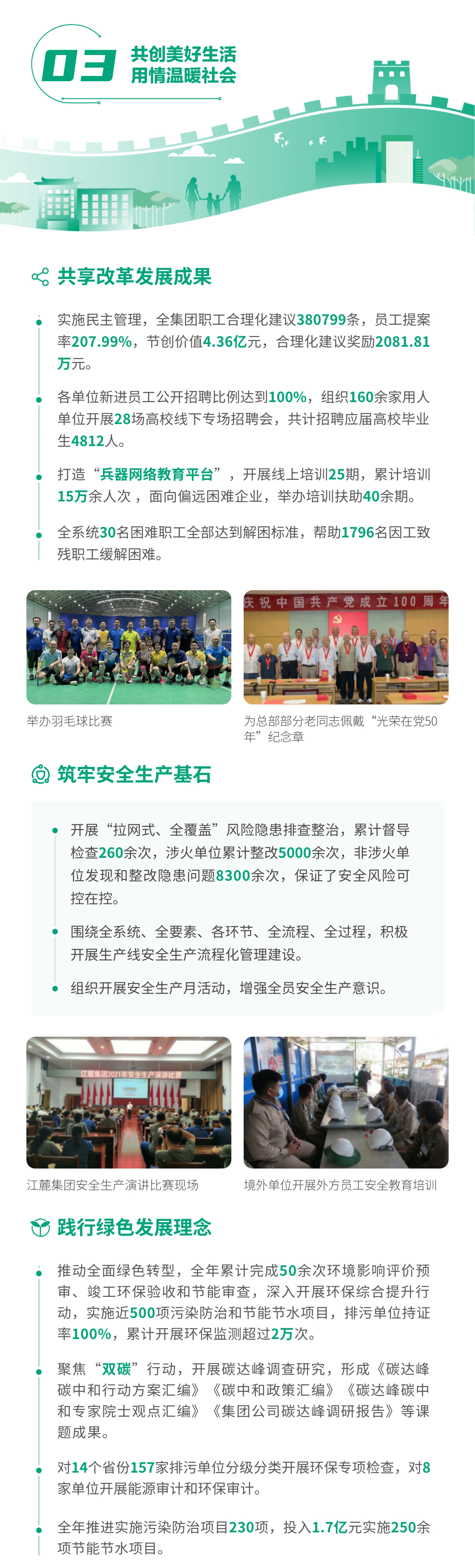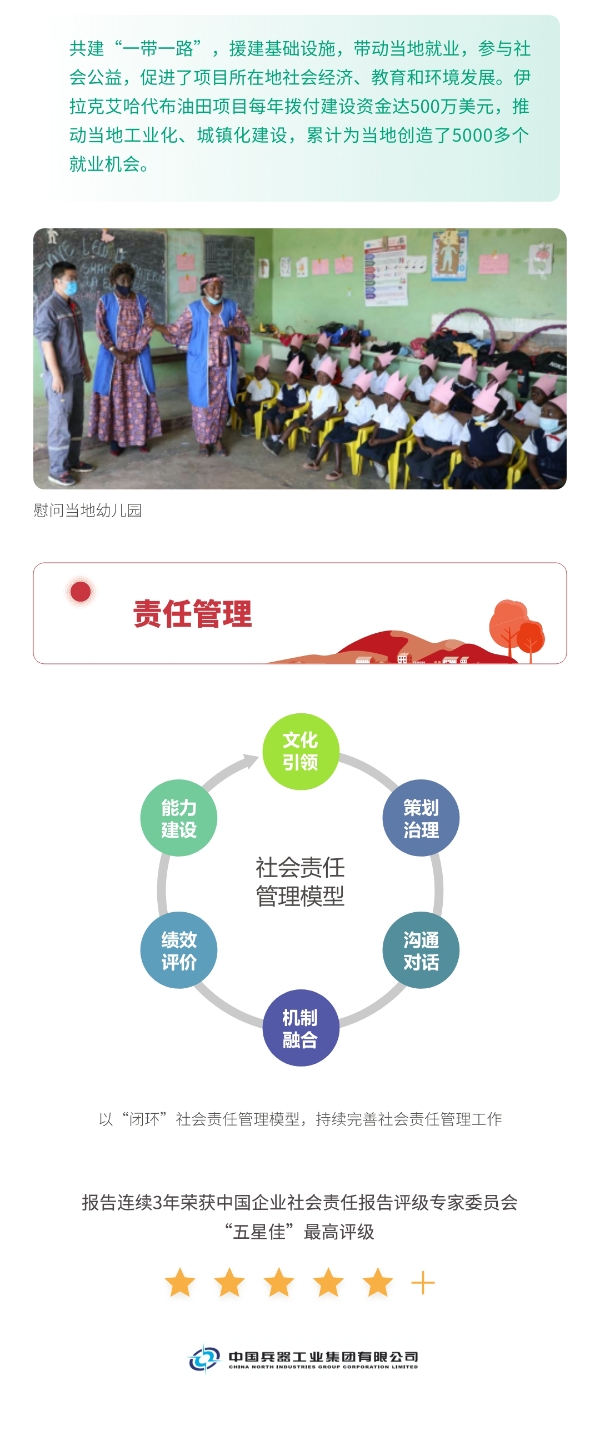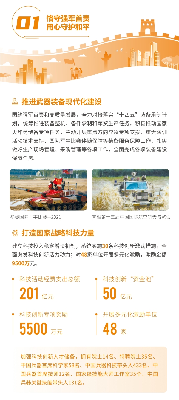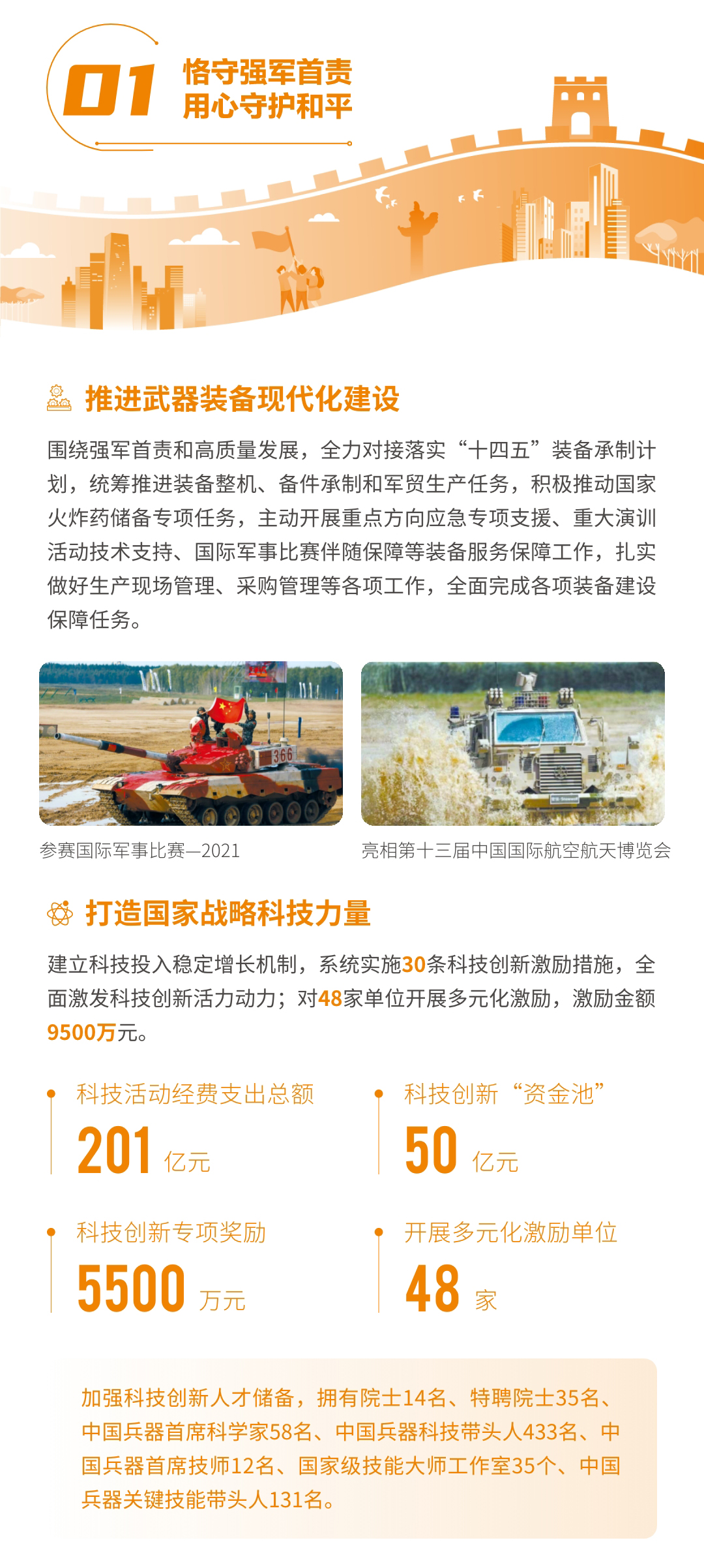 近日(ri),兵(bing)器工業(ye)集團(tuan)(tuan)正式發(fa)布第十三(san)份年(nian)度社(she)會(hui)(hui)責任(ren)報(bao)告(gao)——《中國兵(bing)器工業(ye)集團(tuan)(tuan)有限(xian)公(gong)司(si)2021年(nian)社(she)會(hui)(hui)責任(ren)報(bao)告(gao)》,以“用心(xin)守(shou)護(hu)和平(ping)、用力爭創一流、用情溫暖社(she)會(hui)(hui)”為主題,從恪(ke)守(shou)強軍首責、服務經(jing)濟建設、共創美好(hao)生活三(san)個(ge)維度,向社(she)會(hui)(hui)全(quan)面(mian)披(pi)露2021年(nian)度履責實踐(jian)和履責業(ye)績。《報(bao)告(gao)》連續第三(san)年(nian)獲得(de)中國企(qi)業(ye)社(she)會(hui)(hui)責任(ren)報(bao)告(gao)評級專家委員會(hui)(hui)“五星佳(jia)”評級,兵(bing)器工業(ye)集團(tuan)(tuan)成為軍工行(xing)業(ye)唯一連續11年(nian)獲得(de)五星及五星佳(jia)最高評級的企(qi)業(ye)。 一圖解碼兵器工業的“責任力量”