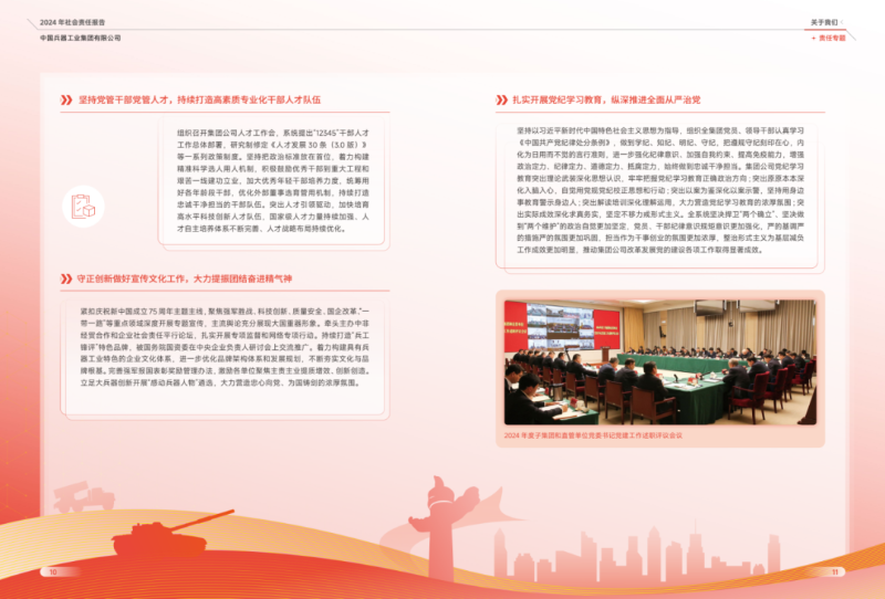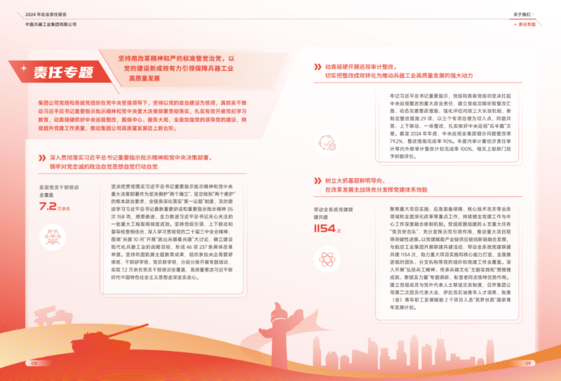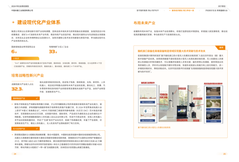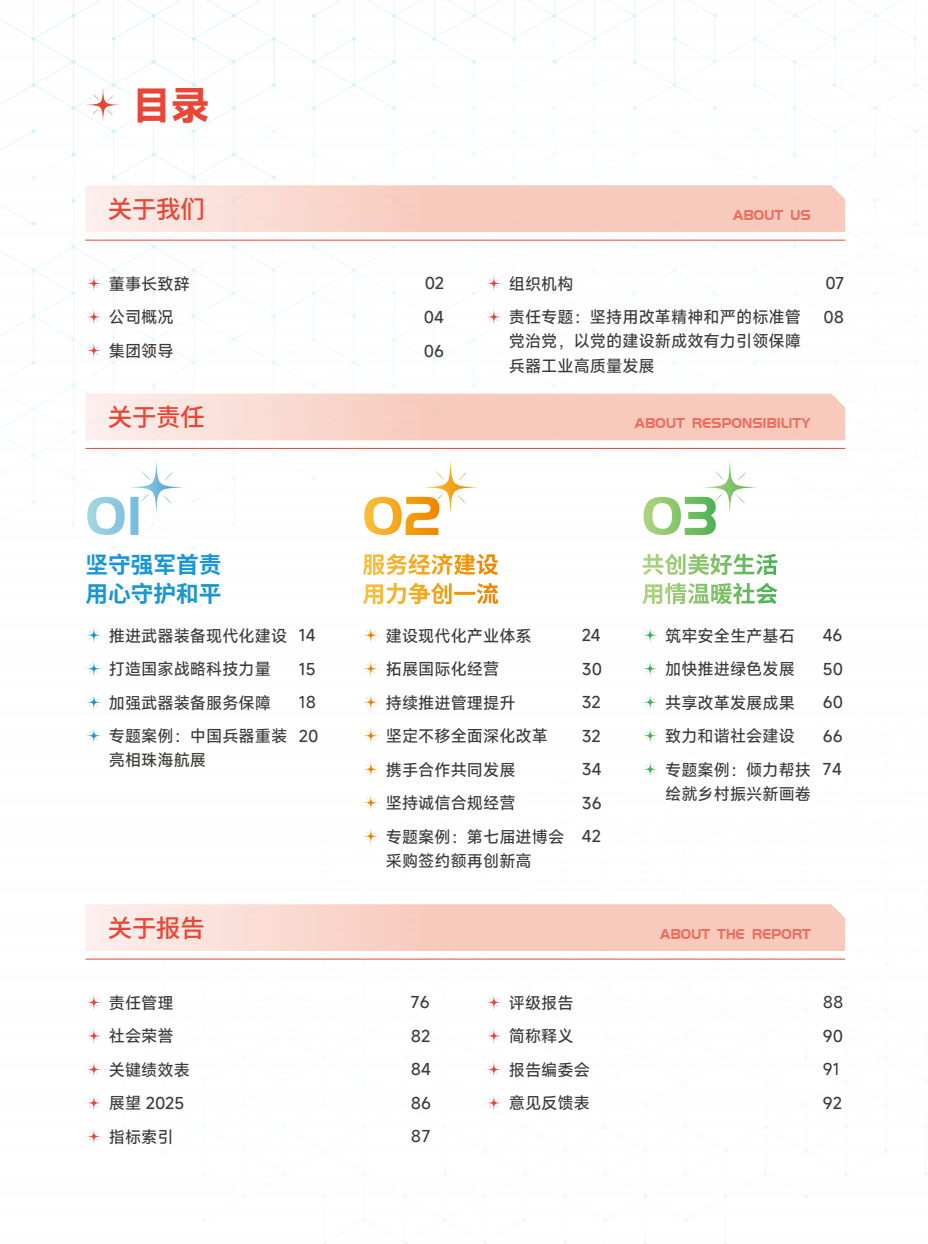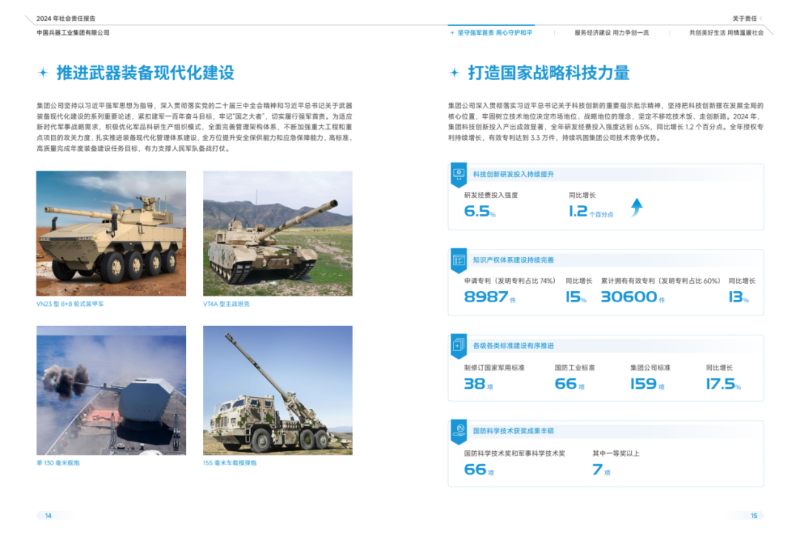 近日,中(zhong)(zhong)国(guo)兵器工业(ye)集团有限公(gong)司(si)正式发布《中(zhong)(zhong)国(guo)兵器工业(ye)集团有限公(gong)司(si)2024年度社(she)(she)会责(ze)任(ren)(ren)报告》。本次报告是集团公(gong)司(si)第16份年度社(she)(she)会责(ze)任(ren)(ren)报告,从坚守(shou)强军(jun)首责(ze)、服务经(jing)(jing)济建设(she)、共创美好生活(huo)三(san)个维度,全面展(zhan)示(shi)集团公(gong)司(si)履行社(she)(she)会责(ze)任(ren)(ren)的(de)实(shi)践与成效。经(jing)(jing)中(zhong)(zhong)国(guo)企(qi)业(ye)社(she)(she)会责(ze)任(ren)(ren)报告评(ping)级专家委员会评(ping)定,《报告》获得“五星佳”最高评(ping)级,成为军(jun)工行业(ye)唯(wei)一一家连(lian)续(xu)6年获此(ci)殊荣的(de)中(zhong)(zhong)央(yang)企(qi)业(ye)。 兵器工业(ye)集团2024年度社会责(ze)任报(bao)告 部分内容摘录 ↓↓↓